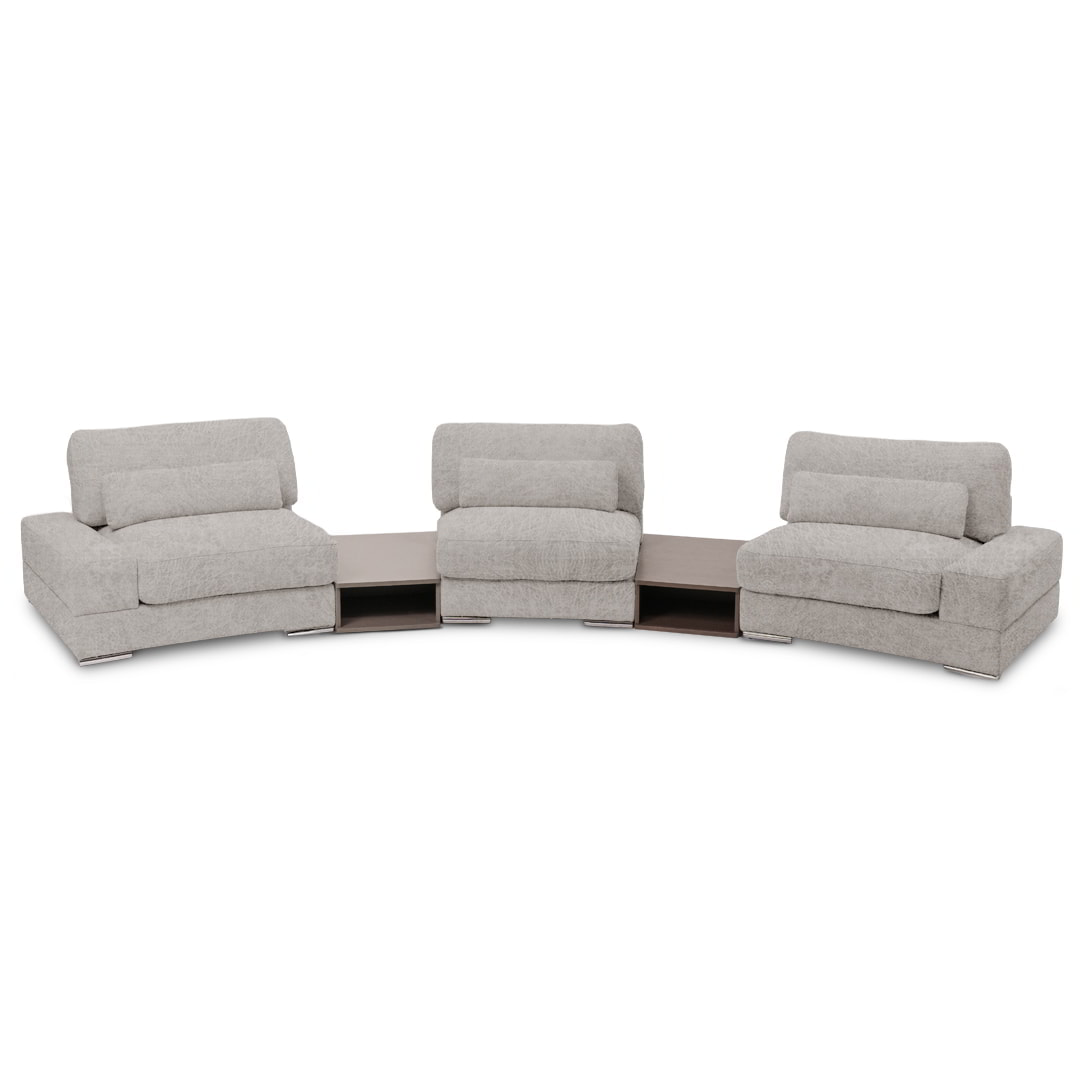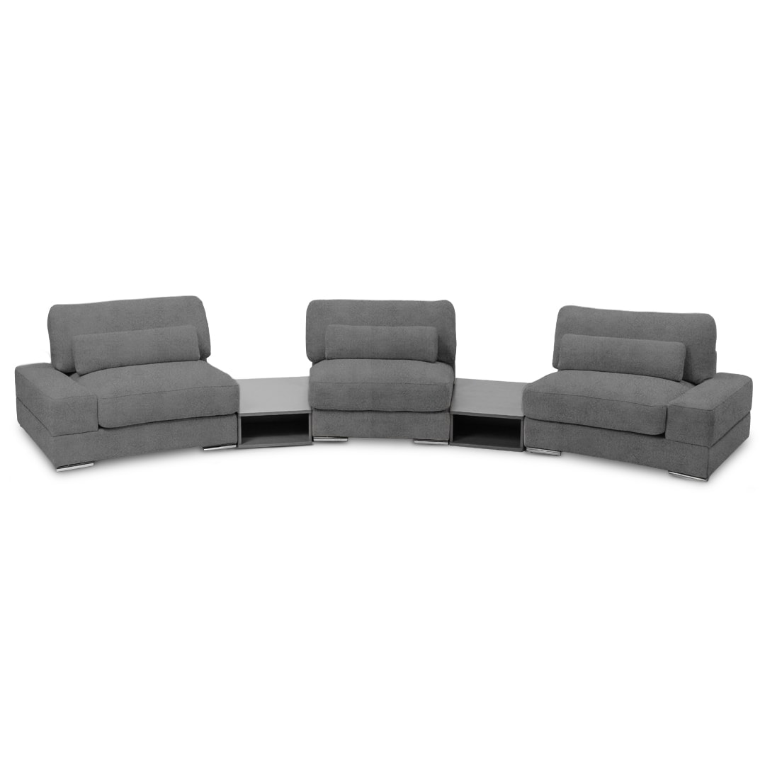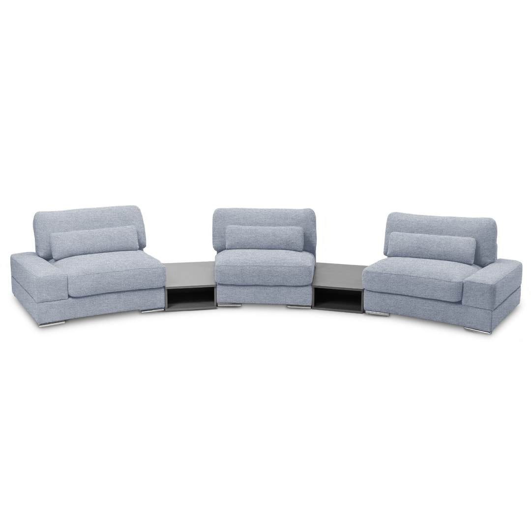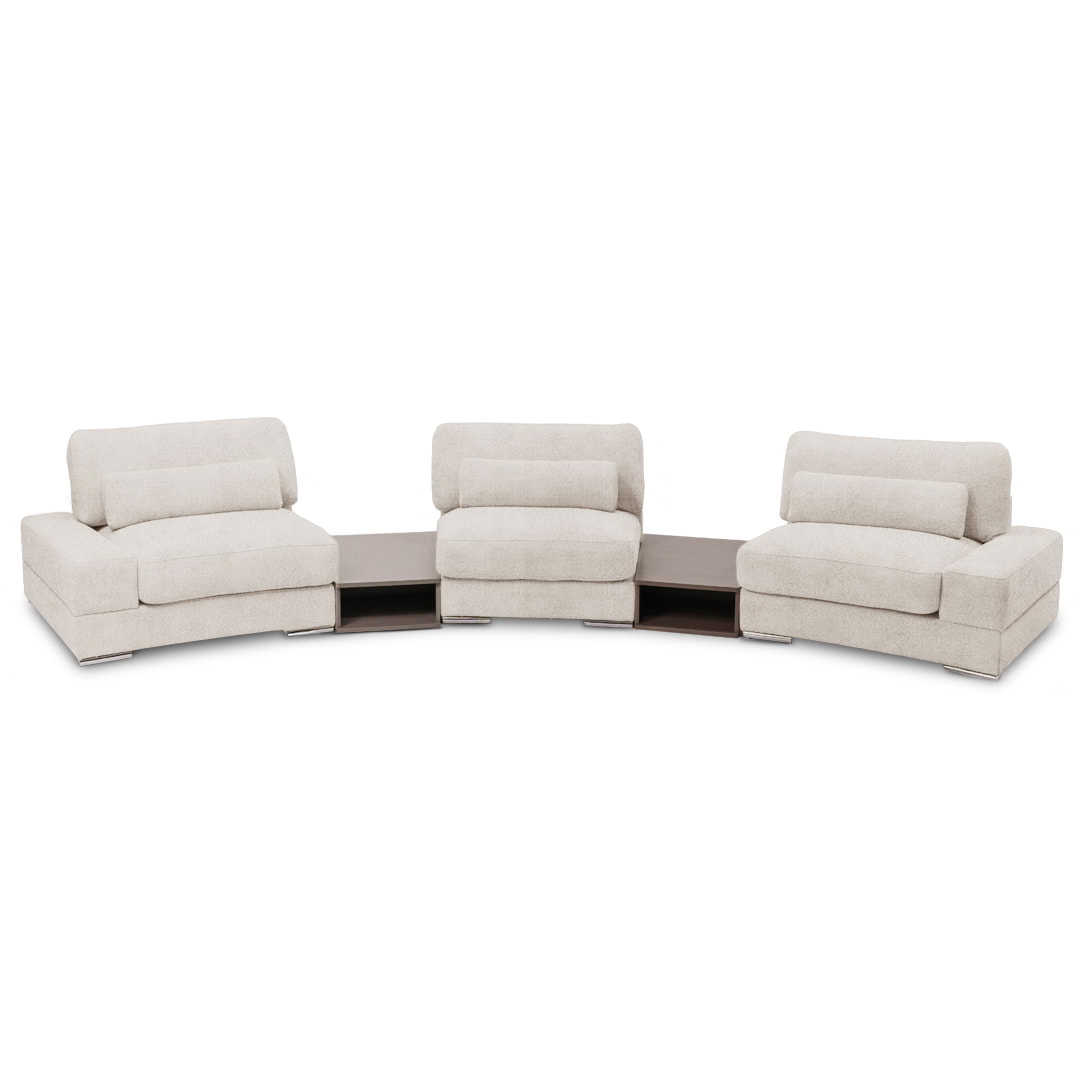 Diseñado bajo un sistema modular, Bianca permite múltiples configuraciones para adaptarse con fluidez a distintos espacios, estilos y necesidades. Está disponible en dos módulos con brazos, un módulo sin brazos y dos sofisticados módulos mesa de melamina de 18mm, lo que favorece tanto su transporte e instalación, como la personalización del ambiente.