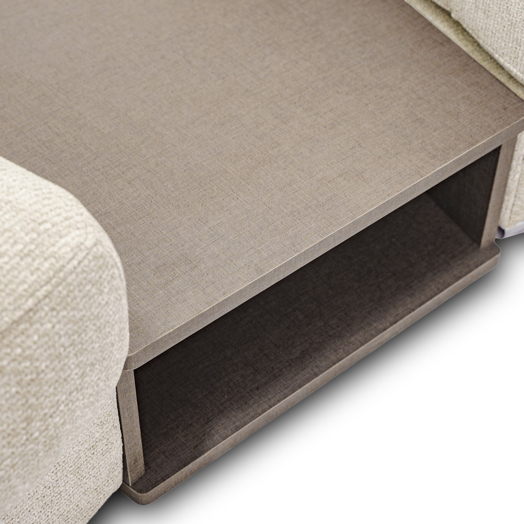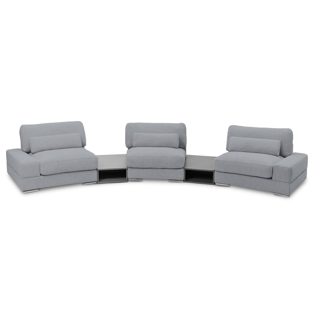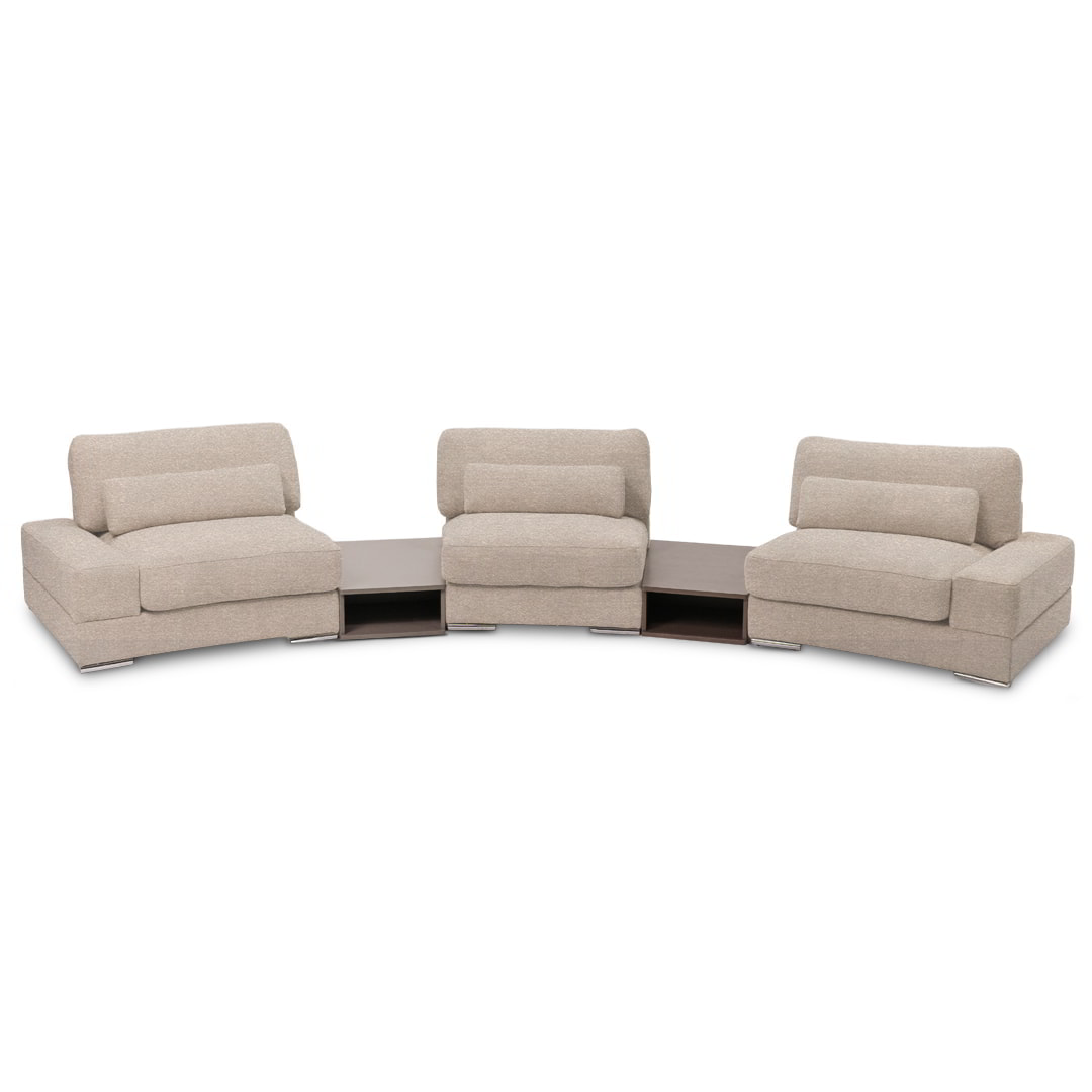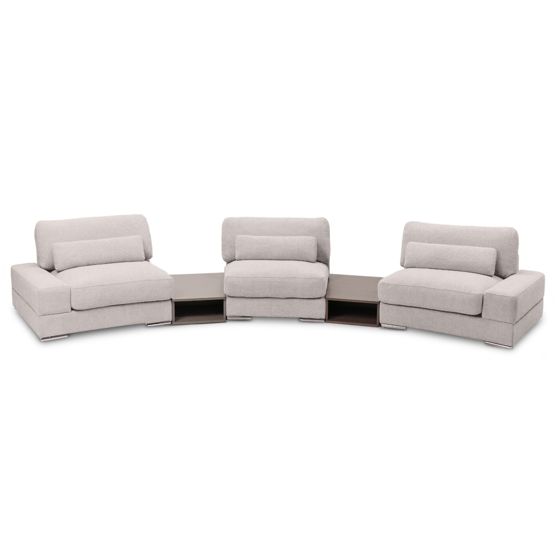 Diseñado bajo un sistema modular, Bianca permite múltiples configuraciones para adaptarse con fluidez a distintos espacios, estilos y necesidades. Está disponible en dos módulos con brazos, un módulo sin brazos y dos sofisticados módulos mesa de melamina de 18mm, lo que favorece tanto su transporte e instalación, como la personalización del ambiente.