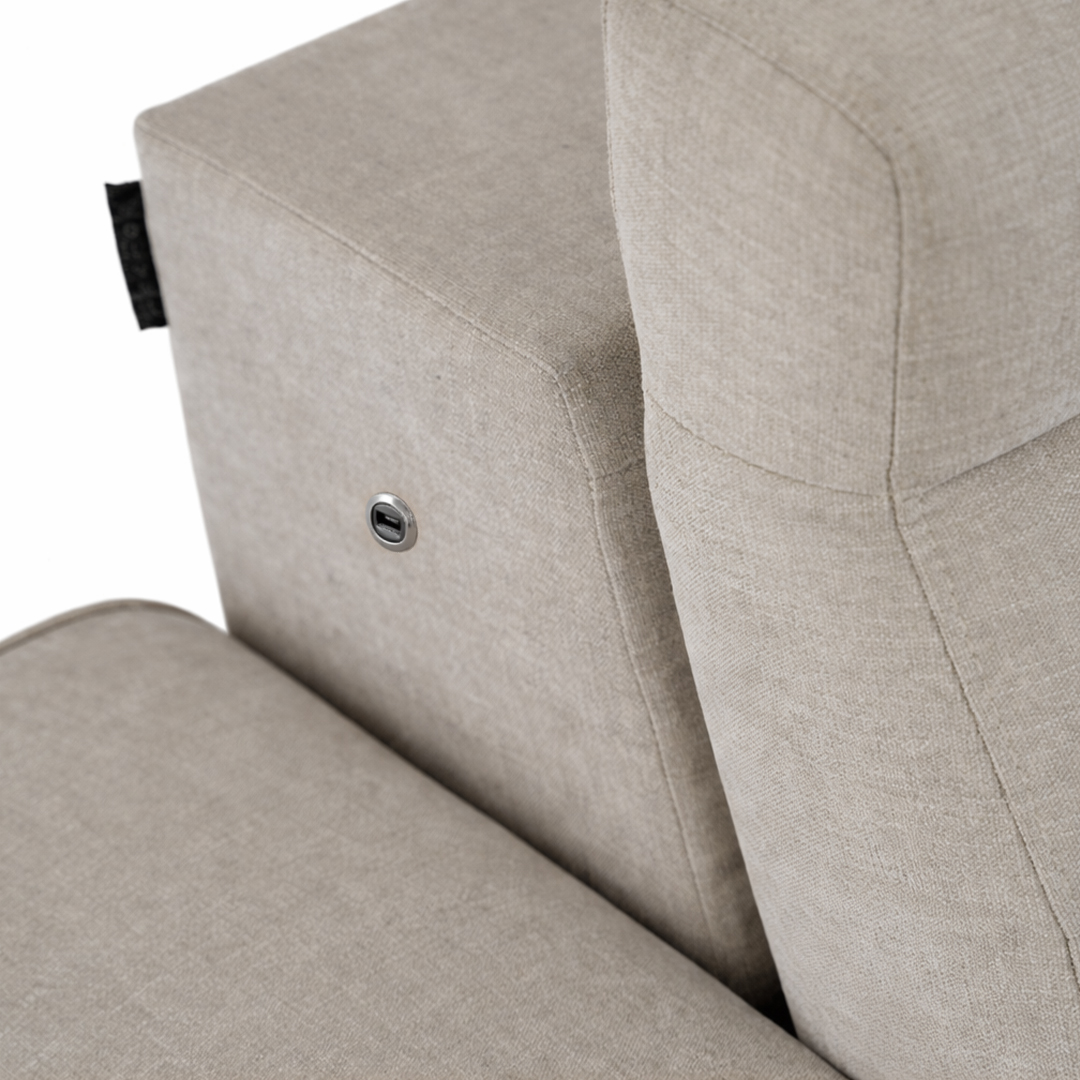 Su diseño cuenta con un práctico puerto USB integrado que permite cargar dispositivos móviles de forma cómoda mientras disfrutás del sofá. Además, en su estructura se puede incorporar tecnología opcional como equipo de audio y luces LED, integrando confort, entretenimiento y modernidad en una misma pieza.